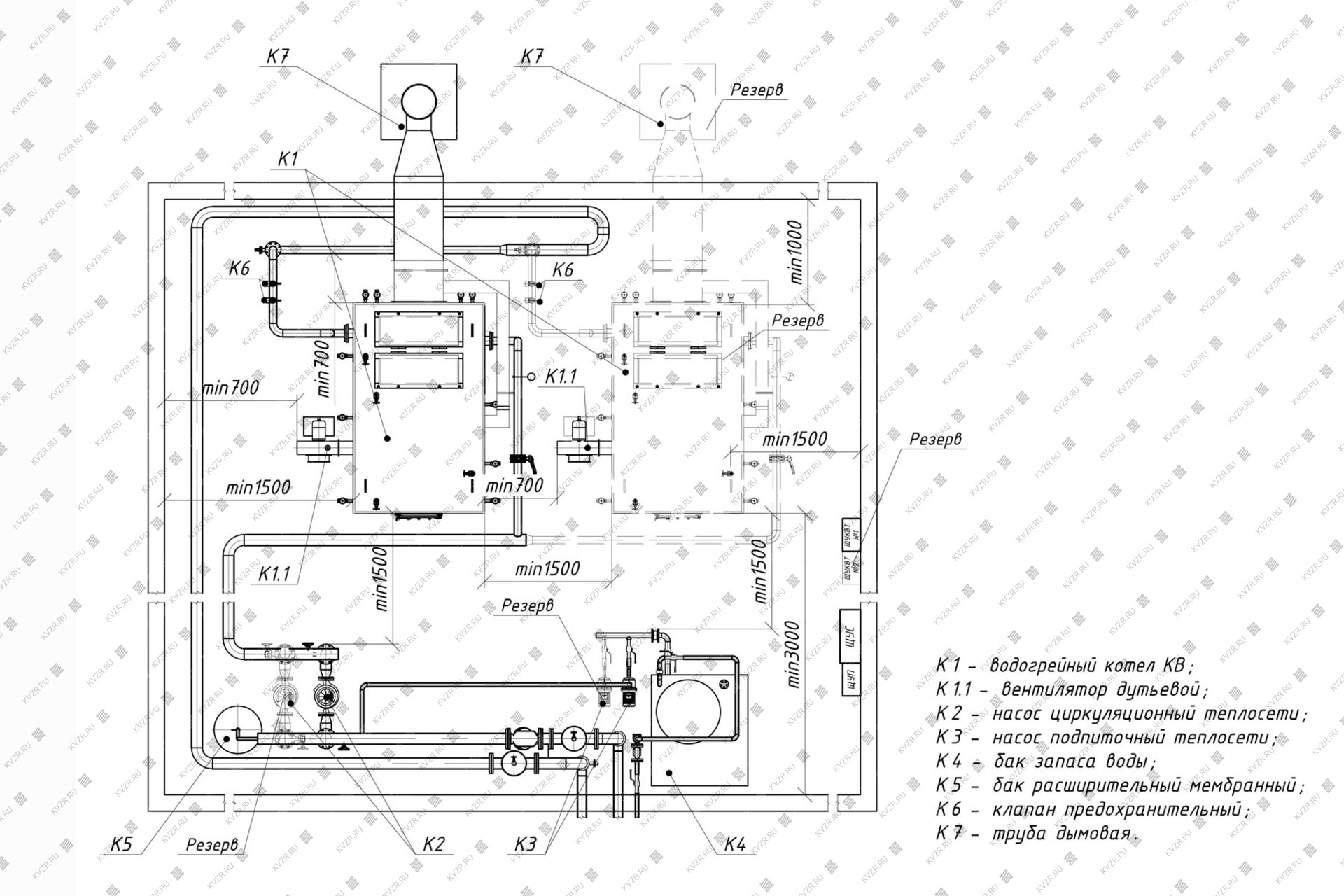 Чтобы правильно подключить котел КВ-1.1 без дымососа на самотяге в котельной необходимо оставить проемы для обслуживания оборудования во время эксплуатации. На представленной здесь схеме указаны их минимальные размеры. Кроме того, в данной примерной схеме монтажа водогрейных котлов и оборудования указан перечень минимально необходимого вспомогательного оборудования для правильной работы котла.