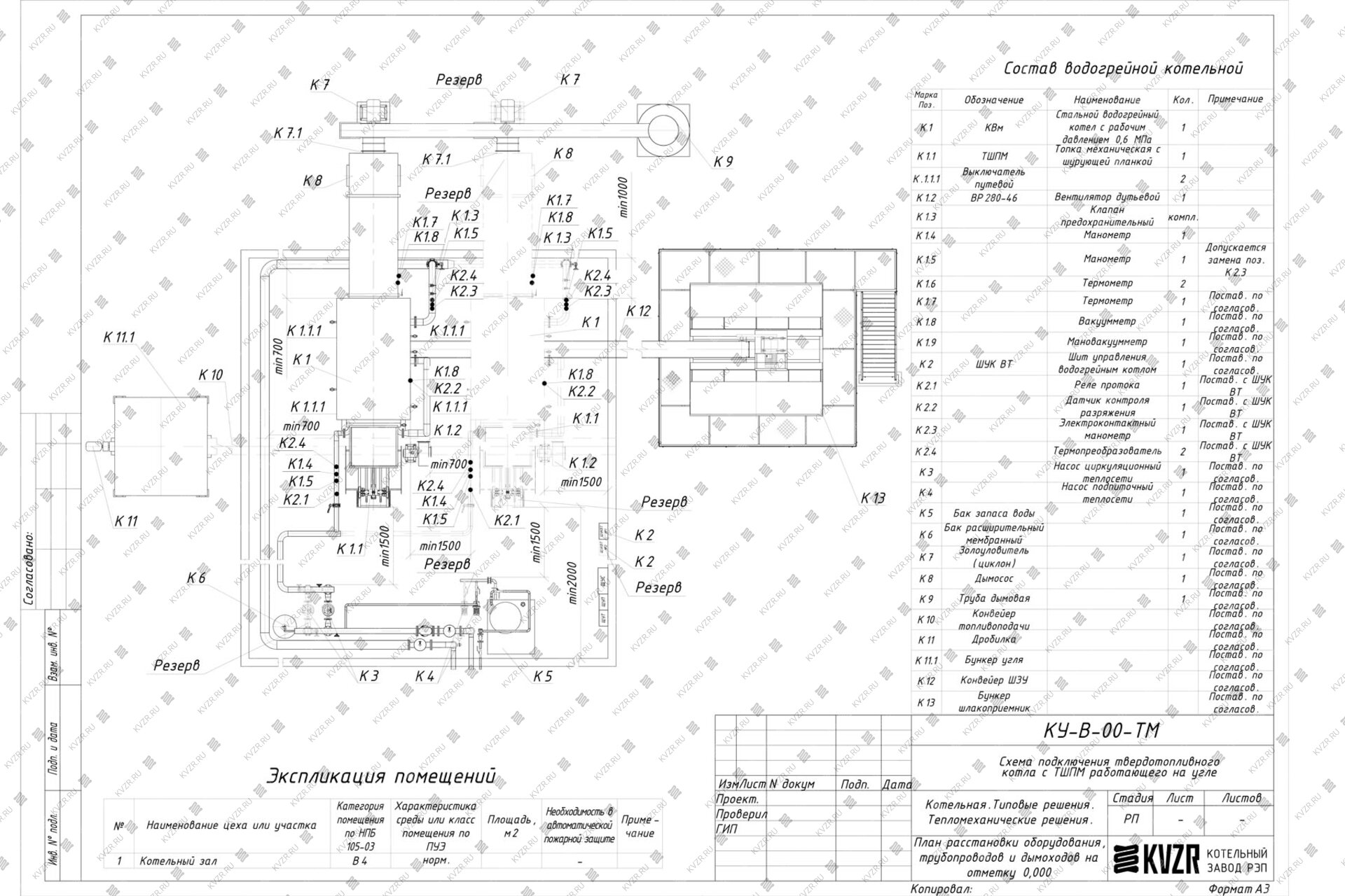 Для эффективной и надежной работы котла КВм-1.0 с ТШПМ в вашей котельной вам потребуется дополнительное оборудование - автоматика ЩУК, дымосос, насос сетевой и подпиточный, золоуловитель (по желанию), транспортеры, газоходы и переходники для газового тракта, дымовая труба. Мы предлагаем рассмотреть типовые варианты комплектации.