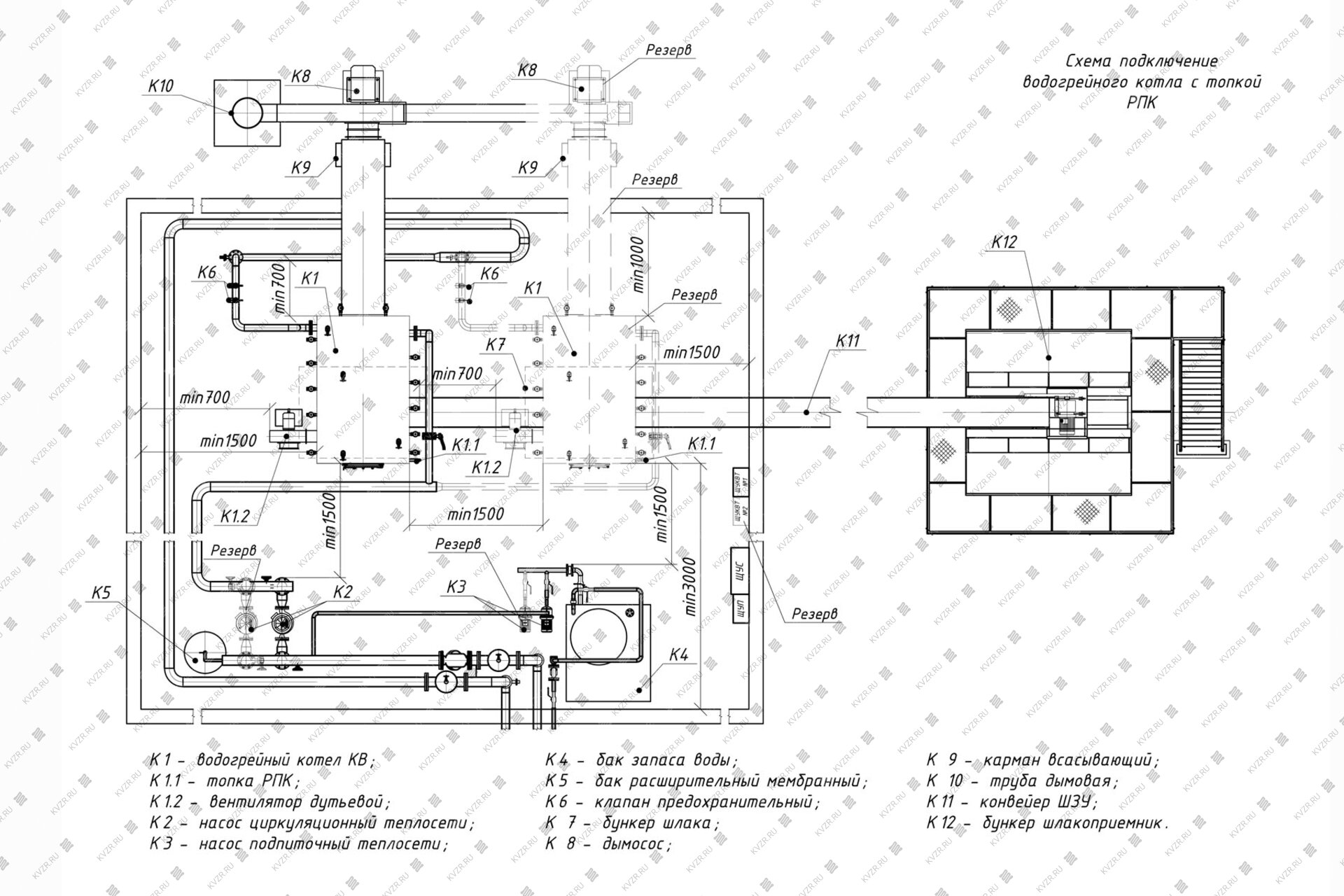 Чтобы правильно подключить котел КВм-1,25 с топкой РПК в котельной необходимо оставить проемы для обслуживания оборудования во время эксплуатации. На представленной здесь схеме указаны их минимальные размеры. Кроме того, в данной примерной схеме монтажа водогрейных котлов и оборудования указан перечень минимально необходимого вспомогательного оборудования для правильной работы котла.