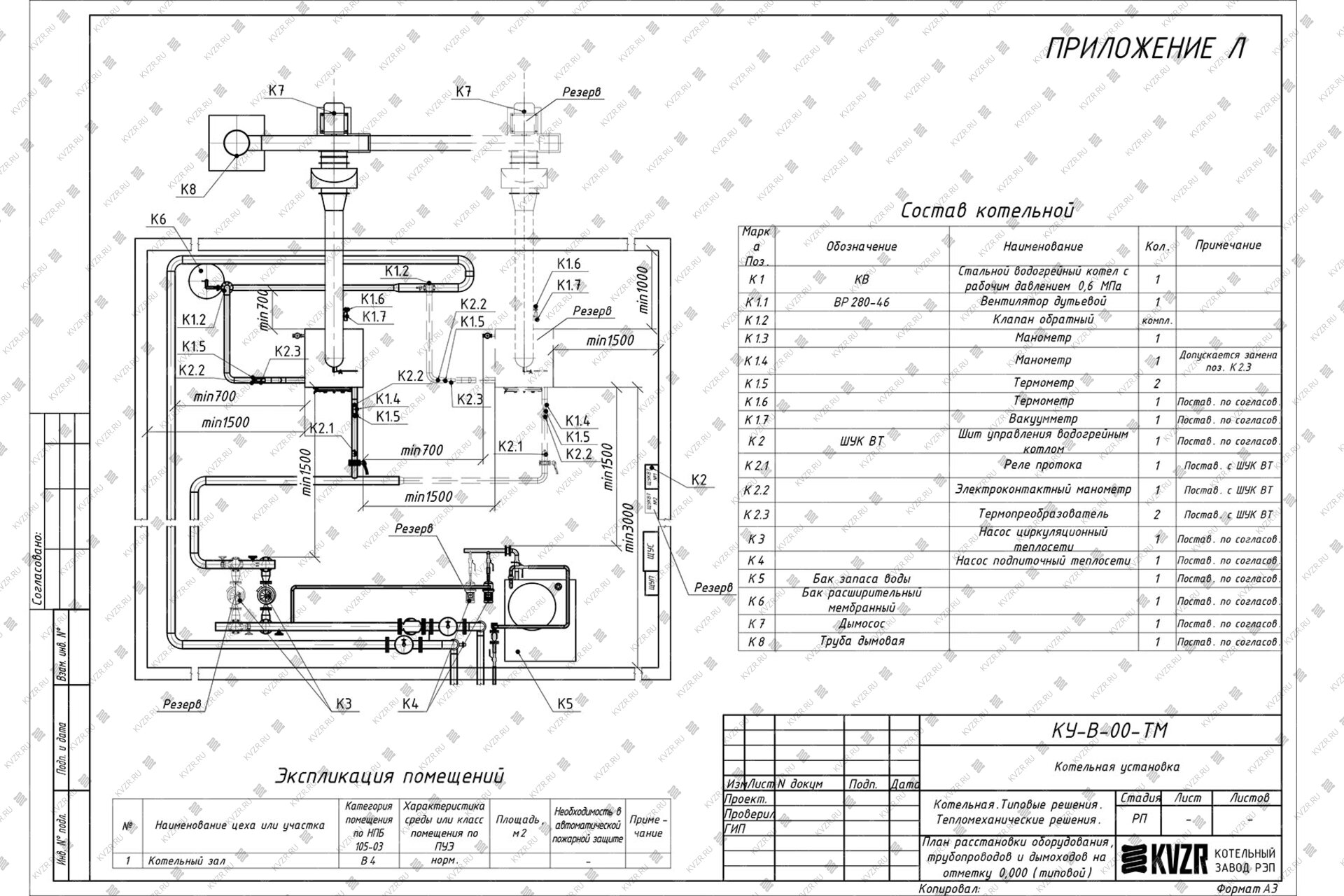 Чтобы правильно подключить котел КВр-0.2 в котельной необходимо оставить проемы для обслуживания оборудования во время эксплуатации. На представленной здесь схеме указаны их минимальные размеры. Кроме того, в данной примерной схеме монтажа водогрейных котлов и оборудования указан перечень минимально необходимого вспомогательного оборудования для правильной работы котла.