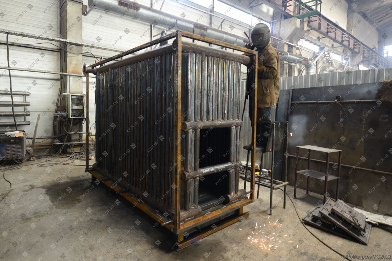 Топка ОУР - это низ топочной трубной части агрегата. Рама топки представляет собой ряд труб, по которым движется нагреваемая в агрегате вода, между которыми вварены полосы металла с отверстиями для подачи воздуха в топку. На водяных колосниках происходит сгорание топлива. За счет движения теплоносителя и воздуха трубы топки охлаждаются. Маленькие отверстия в полосе не дают проваливаться в зольник недогоревшему топливу. Котел твердотопливный дрова уголь с водяными колосниками имеет преимущество перед традиционной колосниковой топкой за счет более равномерно распределяемой области подачи воздуха в слой топлива и отсутствия провала золы в нижний короб агрегата. Механический и химический недожег топлива в данных аппаратах меньше, чем в традиционных. Особенно эффективно применение ОУР для сжигания низкокачественных углей и древесного топлива.
