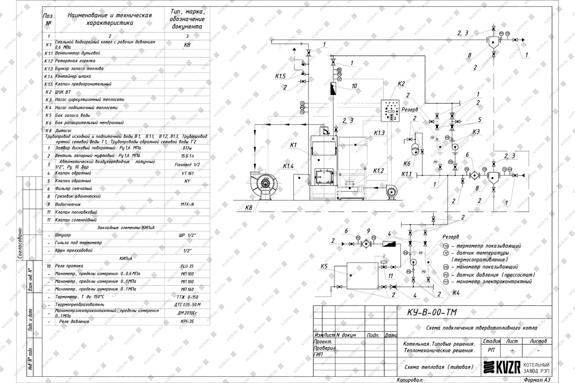 Образец тепловой схемы подключения оборудования в котельной приведен на данной схеме. При эксплуатации очень важно грамотно осуществить подключение оборудования, установить все контрольно измерительные приборы, для контроля параметров работы котельной и запорную арматуру для оперативного переключения потока теплоносителя при плановой или аварийной остановке оборудования. Данную схему можно использовать как пример для разработки под свой объект или заказать у нас разработку индивидуальной схемы для вашей котельной.